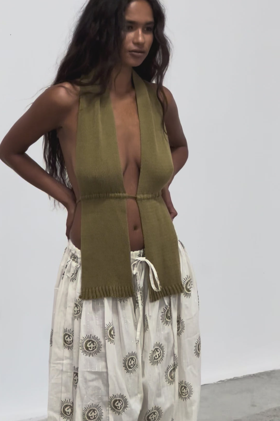 Pantalón de algodón con cintura elástica y cordón ajustable. Pierna amplia y puño en el bajo. Estampado artesanal en tono oliva sobre base cruda