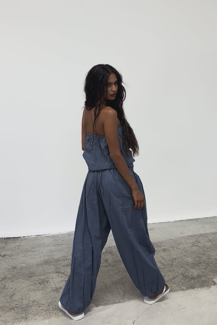 Pantalón amplio en color azul con cintura elástica.