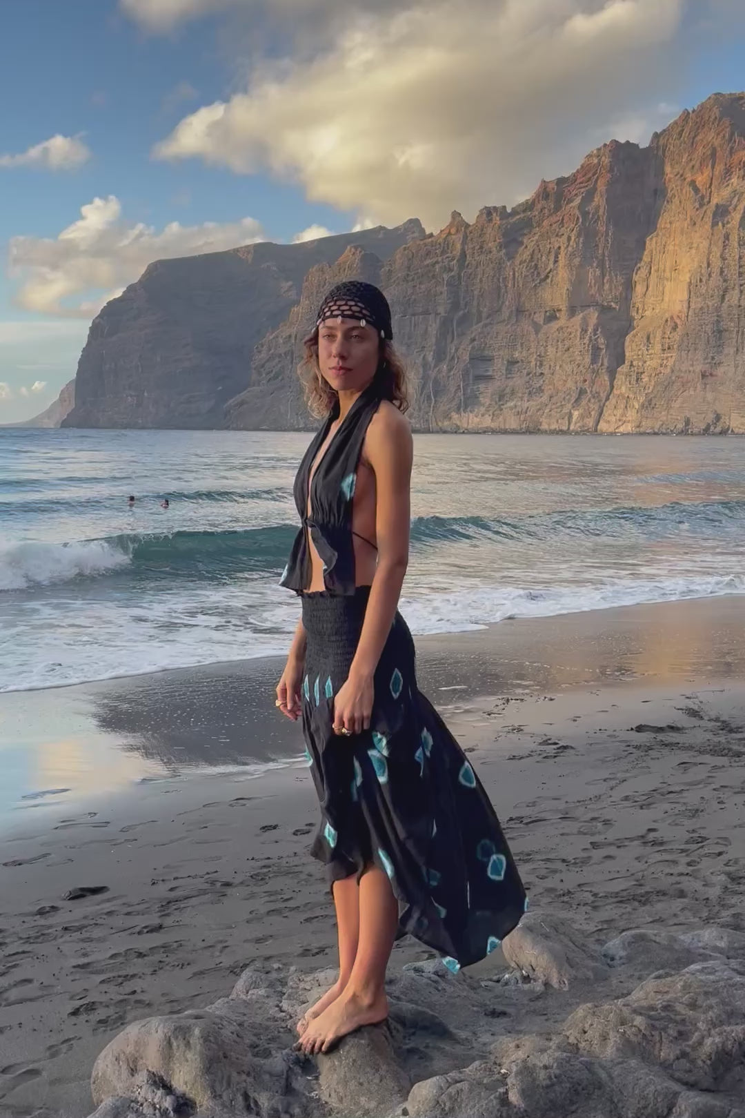 Top con espalda descubierta con tira ajustable en cintura realizado con la técnica manual de shivory con tintes naturales en color negro con detalles azules